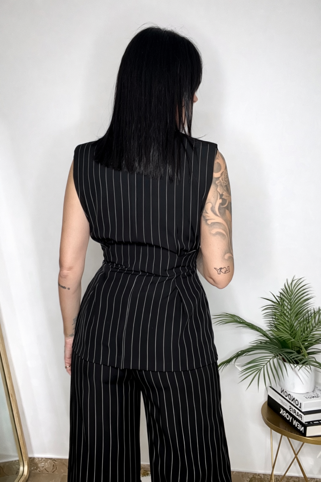 Completo gessato composto da gilet strutturato e pantalone coordinato.